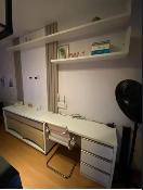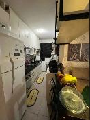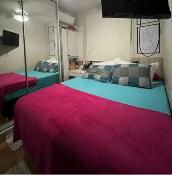 Sofá baú, mesa com cadeiras, geladeira, fogão cooktop, suggar, bebedouro, banquetas, cama queen baú, cama auxiliar solteiro e ventilador de teto.